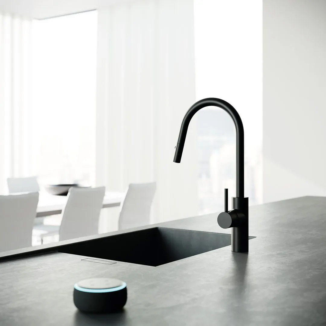 Die zunehmende Digitalisierung des Alltags hat längst auch die Küche erreicht. Nicht nur grundlegende Funktionen der Haustechnik wie Licht, Heizung oder Verschattung lassen sich hier digital vernetzen, sondern darüber hinaus werden auch Küchengeräte und Kochutensilien selbst smart. So kommuniziert etwa die smarte Dunstabzugshaube mit den Kochfeldern, um abgestimmt auf den jeweiligen Kochvorgang ihre Leistung selbst zu regulieren. Oder die vernetzte Pfanne wiegt die hineingegebenen Zutaten automatisch ab und überträgt die Daten samt Informationen über Nährwerte und Kalorien auf Smartphone oder Tablet. „Bislang war in der digital vernetzten Küche die Spüle eine letzte ‚analoge Insel‘“, erzählt Leonardo de Muro, Group Marketing Vice President. „Wir machen jetzt auch die Küchenspüle smart.“ Möglich wird dies durch die Weiterentwicklung der weltweit ersten hybriden Küchenarmatur Kludi-E-GO zu Kludi-E-GO Voice.