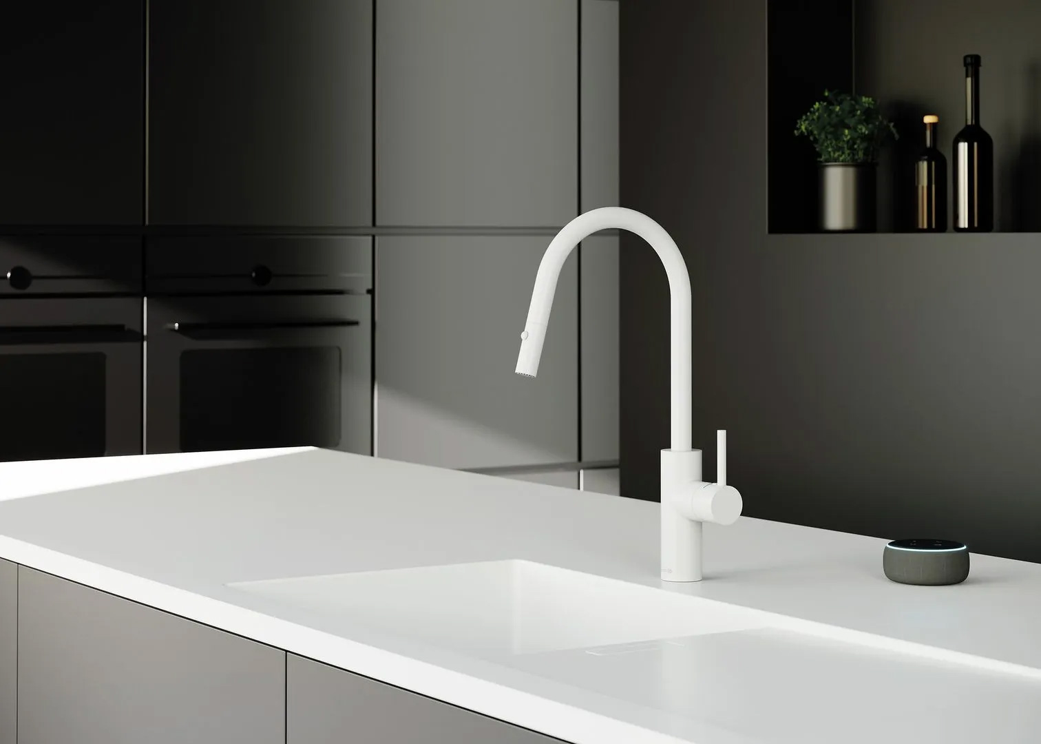 Erhältlich ist Kludi-E-GO Voice in der klassischen Variante mit filigranem, halbrundem C-Auslauf. Praktisches Plus: Die herausziehbare Geschirrbrause mit zwei Strahlarten sorgt für mehr Bewegungsfreiheit an der Spüle. Verfügbar ist die smarte Küchenarmatur in den Oberflächen Chrom, Mattschwarz und Mattweiß.
